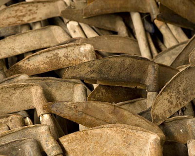 毛同强的作品,就是把“镰刀和锤子”变成了一堆“被遗弃的废铁”的,他从现成品的艺术框架出发,从2005年开始,花了三年时间,收集了三万把镰刀和锤子,当“镰刀”加“锤子”一起出现时,就不再是工具意义上的镰刀和锤子,而联系着一个世纪以来的共产主义运动的意识形态。当这堆锈迹斑斑,残破不堪的“镰刀和锤子”堆集成一大整屋子时,就有一种震撼感,仿佛每一把“镰刀和锤子”都诉说着不止一个故事,三万个甚至难以计数的故事,就汇成了沉默而恢弘的饮泣!因为,每一把镰刀和锤子都联接着使用过它的主人――普通甚至最底层的工人或者农民们的命运!