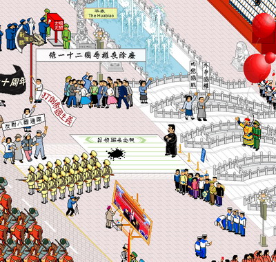 这幅以天安门为主题的长卷式作品,从2005年10月开始,至2006年7月基本完成。通过电脑像素图(Pixel Art)绘画形式,描绘整个天安门及广场周边从建成至今约500年的重大历史事件,以近现代中国发生在天安门的历史为主,把各个时代的人物、事件集合于一幅图中,再结合一些当下的社会现象为内容。2006年8月于北京