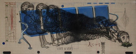 李满金 翅膀 布面丙烯水彩炭笔铅笔 150X250cm 2010年