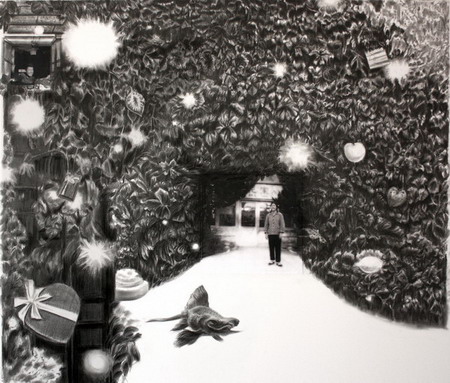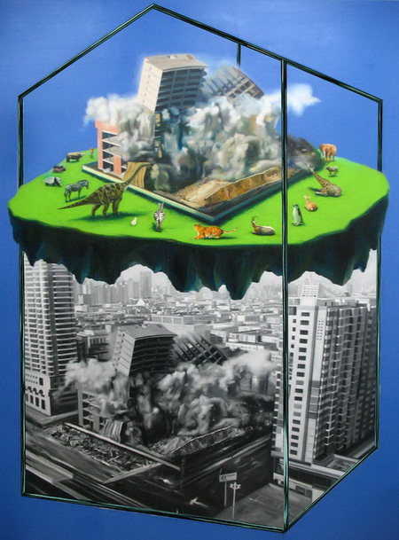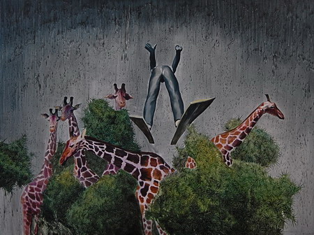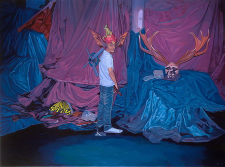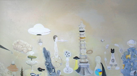 艺术的当代性除了表达当下人的生存感受,还会把当下的生存感受与永恒的寓言嫁接,给我们以新的启示。在表现这些寓言时多采用超现实的手法,让陌生的“世界”产生强烈的象征,这样画面不相干事物混杂的潜意识,产生的梦幻、怪诞、静止、神秘感给我们述说生存的道理,也是将永恒哲理的当代化转换。八零后也喜欢这样的神秘语言,内心崇尚神经质而又有深度感。