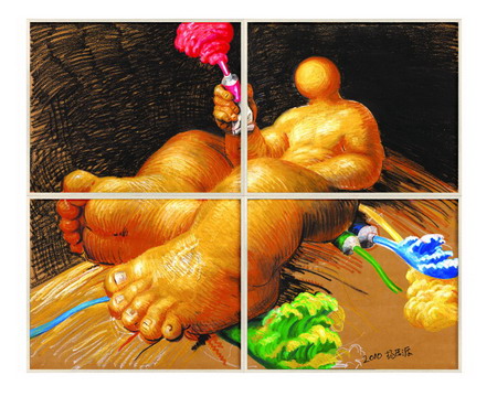 我一直在想栗老师为什么想做这样一个展览,这个展览的意义是什么?和其它以前展览的区别在哪?回顾栗老师和我近几年一起做的展览:08年“生活在宋庄(四)——宋庄及周边艺术群落田野调查展”、09年“群落!群落!”展、2010年“烈日西藏——西藏当代艺术展”到今年的“八零后艺术档案”,这些展览更多从人类学、社会学和生态学视角关注群体生态并且积极植入社会发展。展览里群体社会现象的意义重于每个艺术家的作品意义,把艺术作品个体纳入大的艺术群体之中,让整个群体生态“活”起来,给这个群体中的个体建立一个实际生存的平台。这样的展览重要的不是艺术,也不是精英小众的生态圈,而是把群体艺术的时空差异做为背景。栗老师常说“让艺术圈的这潭死水流动起来,大浪淘沙需要在这潭活水中才能淘出金子,”我们做的事先是把艺术的浪花掀起来。当然这个群体中艺术家的作品选择需和这个群体有紧密的联系,每个个体也体现群体的特征。做年轻人的展览对于一个策展人有很大的“风险”性,可能最后会吃力不讨好。我们在选择艺术作品的时候,既宽松又严格,宽松中作品有层次才会体现真实的群体面貌,严格为了避免作品明显模仿和过度商品化。年轻、真诚而踏实的艺术家虽然作品还在摸索中但也需要展览的滋润和鼓励,这样才能寻找未来发展的信心和可能,避免一些艺术机构的一贯精英化运作模式。当代艺术的价值判断与时代性和未来性有关,八零后艺术将是体现时代和未来特征的艺术,人的生理机能需要生成代谢,艺术也是一样需要不断更换新鲜血液才能永远不灭。这样选择什么样的群体展调查、分类、入档,寻求共性特征介入社会发展是判断展览的重要支点。这样的展览不是纯粹以“保险的精英艺术”为前提,群体现象真实特征在现实的意义更重要,这也开启了另外一种展览价值判断的模式。