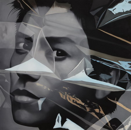 夏小万_素描头像3_玻璃,玻璃彩,特种铅笔_163×120×128cm,22片,6mm玻璃_ 2007