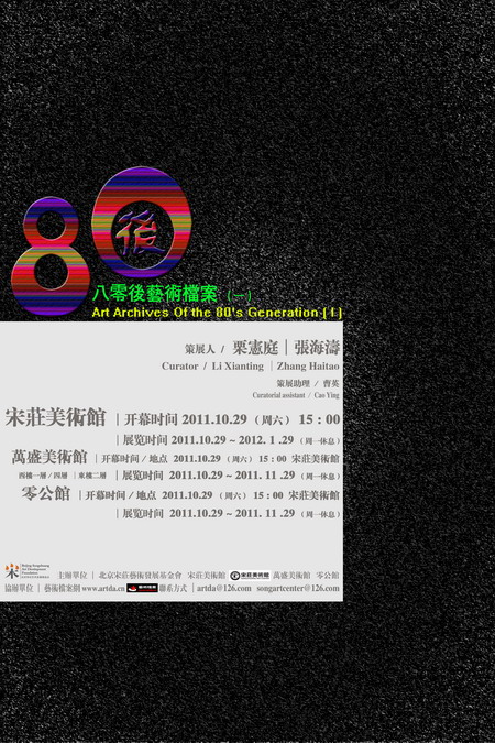 对于八零后社会群体,普遍的人经常会武断的给他们带上一顶“不客观的帽子”,如个性族、不负责任的一代、垮掉的一代、反叛、信仰缺失、无深度、丁克一族、不成熟、无理想无报复、消费娱乐一族、无病呻吟、宅男族、裸婚族、月光族、去政治化、记忆缺失、开放胆大、超感性等等,这些都是其他年代的人群给他们下的共性定义。现实中我们接触的八零后人群中确实有不少这样类型的人,这也是八零后一部分人群在生存环境影响下真实的体现。我们选择八零年代出生的艺术家是因为他们成长于特殊的改革时期,已经形成八零后人群自由、自我、鲜活的生存特点。八零后人群可能会逐步淡化意识形态的影响,而又逐渐受到强大的物质欲望的影响,这样的影响依然没有摆脱精神层面的压力。这些特殊性与六零后、七零后人群的生存背景很不同, 八零后艺术家的作品面貌自然也不同。然而从我们的深入调查中,却“惊人”的发现,八零后最大的人群现在年龄也有31岁,也到了而立之年,他们的作品中50%的艺术依然与七零后艺术家有着传承的特征,具有记忆情感、向往自然、社会责任、自由激情的一面;同时八零后作品也具有自己的强烈鲜活的时代特征:如异常生活、自由自我、数字情感等。八零后艺术档案(一)是栗宪庭老师和张海涛一起组织策划的八零后身份的艺术家展,展览于2011年10月29日在宋庄美术馆、万盛美术馆、零公馆同时开幕,这次展览将展示约200位艺术家的作品,在选择作品的过程中给这些作品进行了归类,这是我们以档案形式展览的目的:以后还会有延续的八零后艺术档案展,多次展览和规模也想为了尽量不带有个人的主观倾向,更想客观呈现这个群体真实的面貌,寻求真实的八零后艺术特征,为现实和未来社会艺术生态良性发展做参考和铺垫。