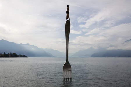 李(日韦)_193-01 李(日韦)和叉子插入日内瓦河_C-print_155×232.5cm_Edition 6_2010.09.06