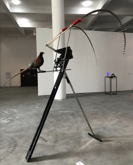 将锦鸡标本主体与锦鸡的尾巴翎毛并置在一起,锦鸡的头与翎子通过机械同步摆动,制造出一种被拔去翎毛的锦鸡反复观看自己翎毛甩动的荒诞场景。