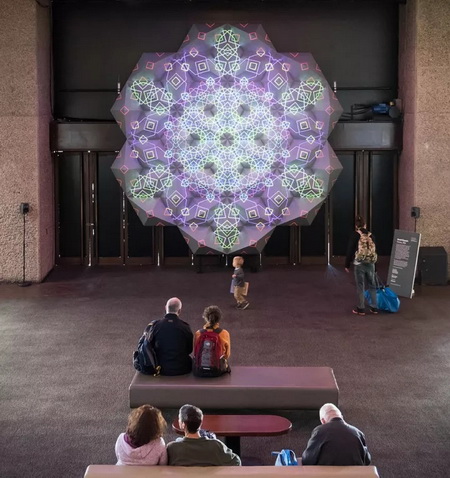《守护神》对传统伊斯兰图案进行了数字化改造,将伊斯兰世界中的艺术和建筑设计与当代数字艺术相融合,通过把动态几何图案投射在由金字塔状模块镶嵌而成的六边形雕塑上,为静态的艺术形式赋予了生命。