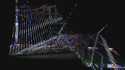 《O.T. 923》是一个基于特定场景的空间艺术作品。艺术家结合了物理、雕塑、装置和投影将作品的最终呈现效果延伸至所有感官的体验。这些线构成一个几何形状,把整个空间切分成各个部分。与此同时,线与线之间的透光又模糊了作品和空间之间的边界。投影的图案是由26种不同颜色的动态光束组成, 颜色编排使得光影产生令人惊叹的视觉效果。
