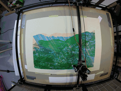 《樱花与山脉》是艺术家用手工制作的机器完成的最新一副艺术作品。画作的五层画面是用不同粗细的丙烯酸记号笔叠加绘制而成。该画作耗时约20个小时,期间需要不断添加墨水检查绘制情况。