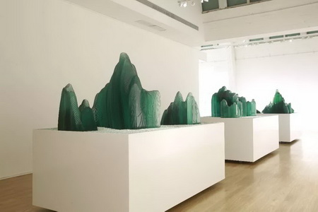 安晓彤说 “我的山水是人们熟知的古代图卷制式和当下图像过剩的转基因产品,我不在乎她看起来像是劫后余生的废墟还是行将消逝的幻象”。而王度的山水,则是复用他过往作品中出现过的—从2D图像转译为3D图像的方式,用玻璃3D转译了几段经典山水图像(一段王希孟的千里江山图,一段武元直的赤壁图,一段燕文贵的江山楼观图卷),看起来类似用替代材料制作的建筑模型。