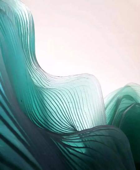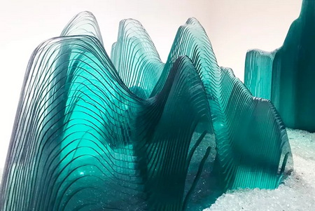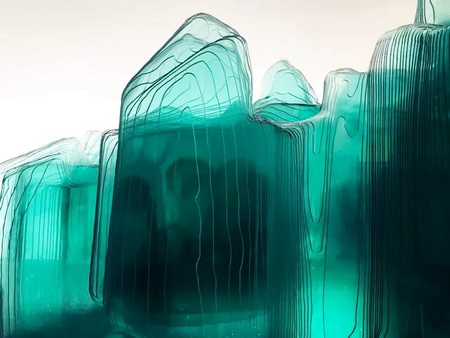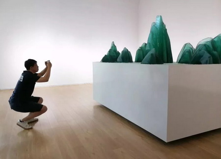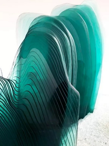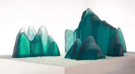 作品使用玻璃、人造大理石、金属等,利用顶尖工艺层层切割、合制,完美转译了三段古代经典山水图像。在完整庄重的体量感之上,又有出乎意料的轻盈、飘逸的视觉美感。