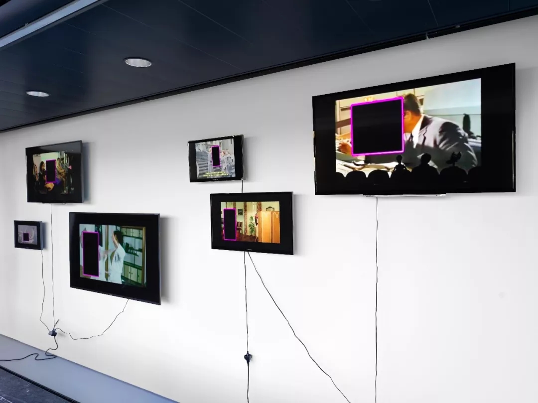 《人工智能, Goooooooooogle渗透》由10个屏幕组成,跨越近14米长的墙,面向柏林路特广场,它探索、利用并批判着谷歌AVA数据集项目。