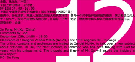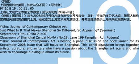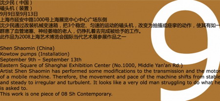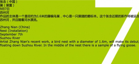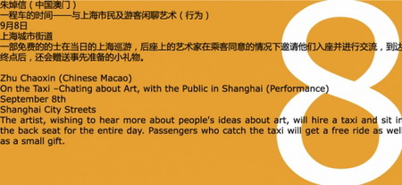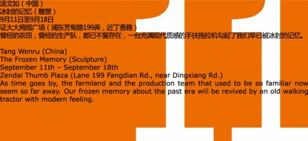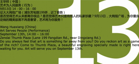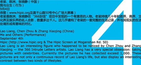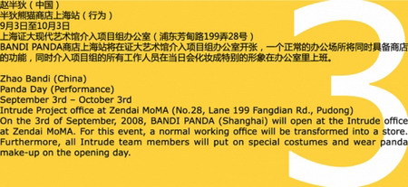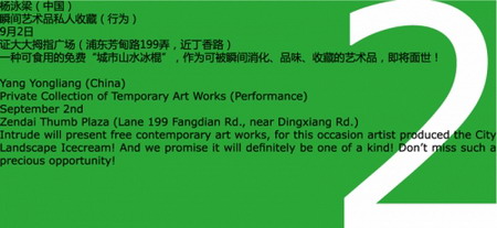 "介入"是上海证大现代艺术馆在2008年的一个大型文化艺术综合项目,它向全世界的艺术家征集方案,并以突破美术馆院墙的方式,在上海的不同公共空间里每天呈现一个艺术项目。在经历了244个“艺术日”之后,“介入”将带给您一个更加绚丽多彩的九月!