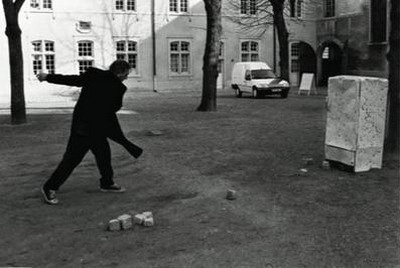 九十年代,我搬回欧洲后的首批作品之一就是为安特卫普一家画廊做的一套二十五台电视机的版数作品。我朝每台电视机的屏幕扔鹅卵石,把屏幕砸碎。两名助手把砸烂的电视搬出去,再把下一台电视搬进来,因为我们也在用录像记录整个过程。起初还挺好玩儿,石头扔出去会听到令人满意的一声爆炸,接着是碎玻璃掉落的声音。但砸了四五台之后,我开始感到不安。剩下的电视机都在一间小屋里等待着灭顶之灾的降临,而我每扔出去一块石头,心里对它们的同情就多出一分。快到尾声时,我心里早就已经又难过又愧疚了。一年后,我选择一台非常五十年代的电冰箱作为石击对象。当时的想法是,一台老式冰箱和电视机或汽车不同,对我对其他人来说都应该是个完全中性的事物——我向其施加的暴力不会让人感到高兴或后悔。所以在一周多的时间内,每天早上我都会把冰箱搬到院子里,然后朝它扔鹅卵石,每次大概持续两个小时。我想改变冰箱的形状。然而,从第一天早上起我就感觉这一行为会让自己不舒服。那台无辜的冰箱那么安静,白得那么纯粹;到最后我给它起了个名字叫做“圣冰箱”(St. Frigo)。同年晚些时候,我和Maria Thereza Alves参加一个驻村项目,合作做录像。其中有一件作品是我从商店里面往外扔石头,打碎临街的橱窗玻璃。但第一部录像记录的是我把一块大石放在船上令其沉没的过程:我们先在沙滩上找到一块篮球大小的石头;然后我再制造出一条船。船沉没时我一点儿没觉得不舒服,可能因为船是我自己造的,而且目的就是为了让它享受这短暂的光辉时刻。巴黎展览的策展人要我对这些作品里的暴力主题做出评论。但我发现自己根本说不出什么道理。朝人造物品扔石头或拿大岩石砸它们跟68年五月风暴不一样;甚至都不是五月风暴的回响。在我看来,它更接近于对自然带有模仿性质的重现。