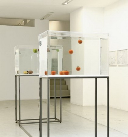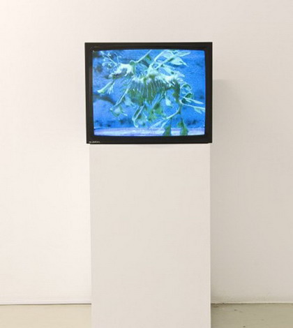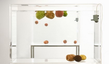 作品“Something that Floats / Something that Sinks”被布置在了展厅中央。通过对漂浮起来的水果与沉下去的水果进行的比较,这件作品揭示了岛袋道浩(Shimabuku)对日常生活物品蕴含的诗意以及内在于最平常的状态之中的奇异性的兴趣。以岛袋道浩(Shimabuku)的话来说,“有的西红柿浮起来了,有的却沉下去了。有的蔬菜浮起来的,有的却沉下去了。我在做饭时总是会注意到这类似的事,我总觉得它们充满了神秘感。因此我决定创作一件关于这种神秘感的作品——我保持了它们的神秘感,让观众能够‘原滋原味’地进行体验。”岛袋道浩(Shimabuku)总是会创作一些与食物或是烹饪有关的作品。对这位艺术家来说,艺术和烹饪都与看起来互不相关的成分进行意想不到地组合以产生某种可口或是赏心悦目的事物有关。人类、野生动植物或是现成物品之间的邂逅贯穿了岛袋道浩(Shimabuku)的整个艺术实践。作品“Onion Orion”同样强调了一个诗意联想的组合:它的灵感来自于词语“洋葱(onion)”与“猎物星座(Orion)”的相似性。展览同名作品“Leaves Swim”则呈现了在水下拍摄的一头海马的华丽影像,为观众呈现了一个充满了“异国风情”的场景——岛袋道浩(Shimabuku)的这件作品只是鼓励我们能够简单地去欣赏这种生物的美丽。