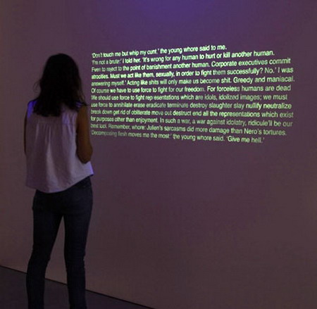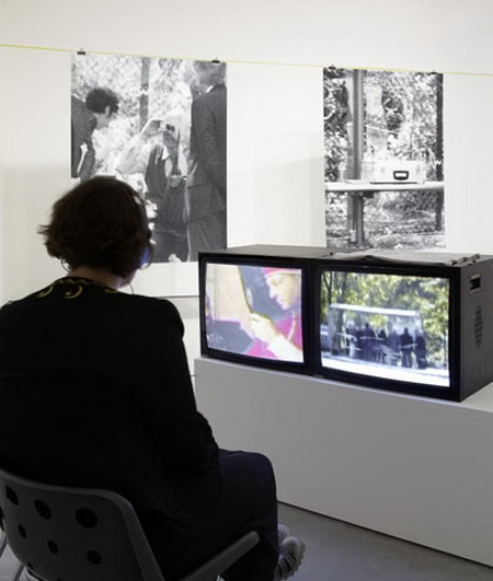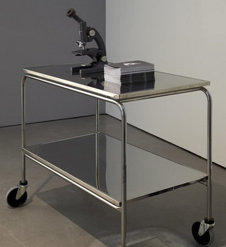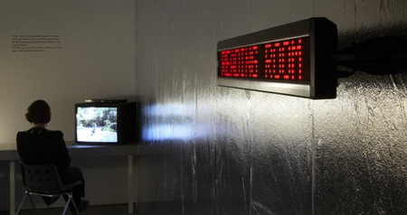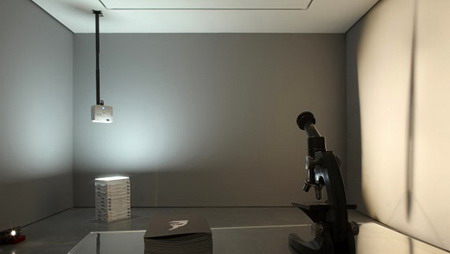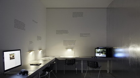 作品“de Paso”(2011-12)原本是受巴塞罗那当代艺术博物馆委托创作的一件特定场域的作品,它在这场展览中被重新情境化了以调查欧盟在1992年对航空工业放松管制所带来的影响及其与伦敦供水的历史的联系。在作品“The Microscope”(2006)中,一台来自麻省理工学院的显微镜的目镜被一个扬声器代替了,而这个扬声器正在播放歌曲《Every Breath You Take》的声码合成版本。在显微镜旁边放着的小册子详细地叙述了娜塔莎·萨德尔(Natascha Sadr Haghighian)与Evelyn Fox-Keller的对话(Evelyn Fox-Keller是麻省理工学院历史与科学哲学教授、《The Biological Gaze》的作者——他在这本书里检验了观察的概念是如何产生科学家在显微镜下真正看到的东西的)。他们的对话讨论了现实的构建是以人类以思维去“看到”的东西而不是眼睛所看到的东西为基础的。这场展览同时还展出了娜塔莎·萨德尔(Natascha Sadr Haghighian)对作品“Trail”(2012)(该作品参加了本届卡塞尔文献展)的调查。她在用来自第二次世界大战的残骸堆成的一个斜坡上构建了一条小道,这条小道与连接了公园及卡塞尔市中心的苏维埃阵亡战士纪念碑(Ehrenmal)平行。当游客从小道上下去时,模仿动物的声音就会从周围的树林和灌木丛里传出来,而这些声音都是由卡塞尔的居民录制的。