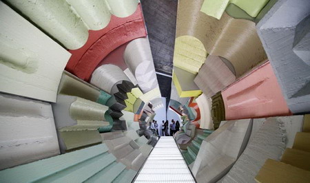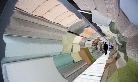 在这件装置中,每一部件相似但并非重复。李松松将整件作品从结构上分为若干局部,逐一完成,将色彩有条不紊地施涂于矩形构件之上。他拒绝提供易读易懂的叙述,只是将“发现”的可能性留给了观众。任何人在初次踏入装置内部之时,恐怕都难免被压倒性的虚空感攫住,继而开始探知和了解到其内部的深度。穿过隧道的历程同时也是一次感知经验的重生,无论对观众还是艺术家本人都是如此。李松松没有给出任何说明或评论,仅仅是邀请我们体验这件作品所带来的挑战:穿越隧道,通过个体感官去发现和探寻色彩和颜料本身的特殊意义。