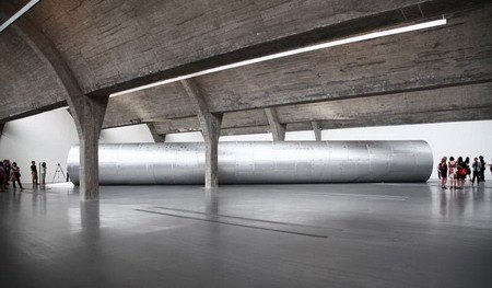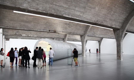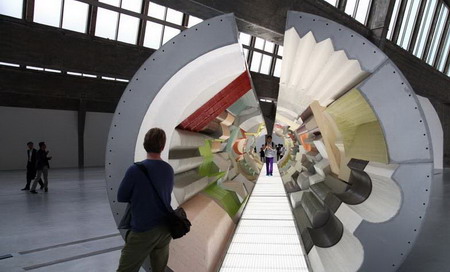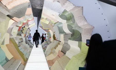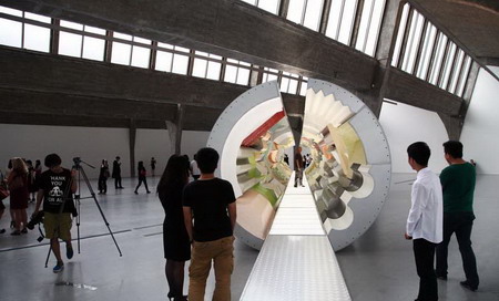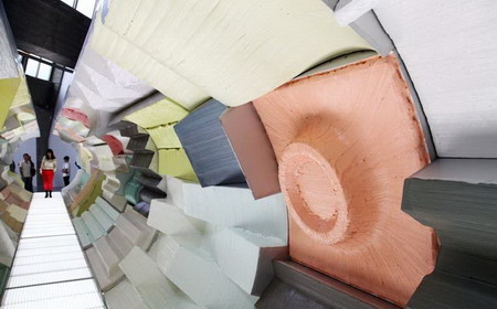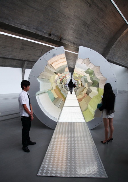李松松独特的图像运用和处理手法已为他赢得国际盛誉。艺术家此前在抽象艺术与表现形式方面多有尝试和探索,本次展览则将这一努力推向极致。整个展览仅由一件装置作品构成。李松松延续了其极具辨识度的厚涂色彩,释放了颜料本身物理性的独特魅力,彻底颠覆了传统结构。作品初看起来像是一条体量巨大的金属隧道。隧道的金属外表面直接曝露于空气中,内表面则由厚重颜料构成各个块面,塑造出波状起伏的阴影,艺术家的标志性手法在此得到充分体现。与以往不同的是,李松松停止了对政治及历史图像的拆解与重构,彻底消除和拒绝了具体的描绘对象。观众将无法诉诸于艺术想象或人物形象来获得对作品的理解,被迫从自身经验出发而构建起自己的诠释。正因于此,这件装置作品划清了同“教育性”或“教育意义”的界限:它仅仅是一个如其所是的通道,以及隐含其中的一段路程。每一次穿行与观看由此成为独一无二、不可重复的经验,折射出作品在观念性上蕴含的无限潜能。