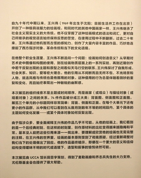 尤伦斯当代艺术中心的展览“王兴伟”展出了艺术家从1993年至今二十年间的74件绘画作品,几乎囊括了王兴伟各阶段的重要作品。这是王兴伟的第一次美术馆规模的大型个展,同样也是尤伦斯大展厅空间首次用于呈现纯绘画的个展项目。展览“王兴伟”并没有采用了常规的与按时间梳理的回顾展的展览体例,而是选择以画家与描绘对象及观众与观看对象这两对关系作为线索,将展览划分为三个单元,即背面、侧面和正面。当被问及这样设计展览形制的原因时,王兴伟表示,一是其以人物为主的绘画作品形态比较丰富,这一分类学上划分的方法非常适宜;二也是为了区别于所谓“回顾展”的概念。他认为自己并非到了功成名就介绍自己的时候。