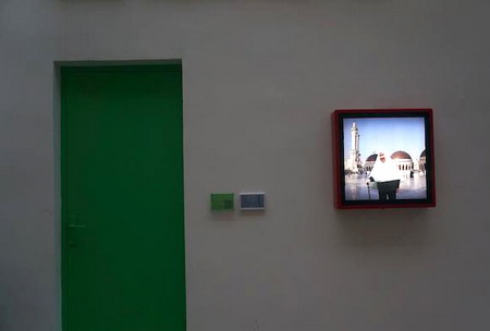 石: 我理解是这样的不知道对不对,从物理层面上这个门是关着的,也就是观众走到本来是可以打开的门前面,他走不通。但是因为门被涂为绿屏,实际上,虽然你进不了一个物理属性的门,但是因为绿屏技术它可以让你打开另外一个——就是你可以通过这个打不开的门去到任何全世界你想去的地方。那么这个门的象征意义就非常的充分。