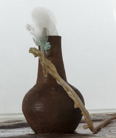 本次展出的作品同样具有自主性,自我生产的概念,而同时,它们也有自己特定的审美。所谓的“泡沫块(foam pieces)”,无论是悬挂在天花板上或者展示在木凳子上,它们都好像从什么都没有的情况开始,一直在不停的产生着泡沫。而陶瓷和钢花盆,这些花瓶和容器内都有洗涤剂、和使空气送入的小型压缩机。时间过去,肥皂水稳步向上,在爆破之前,形成泡泡,然后在地板上形成松垮的痕迹。
