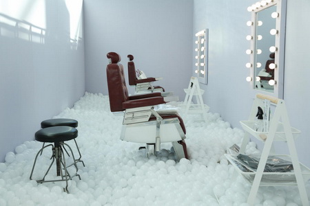 “小大人俱乐部”速写市集最受小孩子欢迎的小大人俱乐部展厅,这家复古绅士风格的理发店里,超有腔调的发廊椅却被放在一片白色的海洋球中,走进小达人俱乐部的小大人们并不是来做个绅士油头的,而是在这里贴上‘Neo Market’的贴画。徐震将标准成人化的元素模拟了一个儿童空间 ,希望和小&大人们一起探讨:究竟是我们塑造了孩子,还是孩子在塑造另一种成人化的人格。