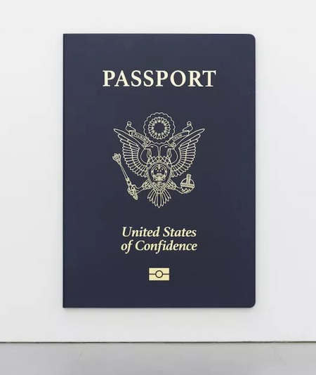 “信心国民”放大自美国护照的正面外观。在其单元构成的基础上替换了欧盟、俄罗斯、中国的符号性元素,“合众为一”,通过绘画的要素,重整为一份“信心合众国”的通关文牒。