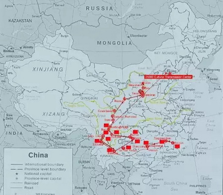 ▲ “长征—— 一个行走中的视觉展示” 全程地图。1999年策划、2002年起在中国实施至今的"长征计划"是一个由卢杰和邱志杰策划的综合多平台的国际艺术计划,在重走长征路的行程中进行一系列视觉创作和展示,是历史、政治、地理、艺术语境之间互动的过程。(图片/art-ba-ba.com)