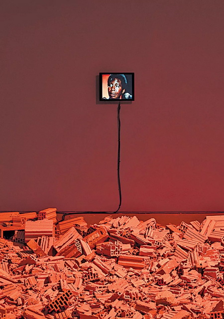 ▲ 迪妮欧·塞舍·波帕佩(Dineo Seshee Bopape),《无题(关于神秘的不稳定性)[感觉]》(局部),2016-18,砖头、灯光、声音、录像、水、餐巾纸、Jabu Arnell, Lachell Workman, Robert Rhee的作品. 展览现场,KW当代艺术中心. 摄影:Timo Ohler.