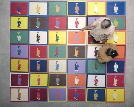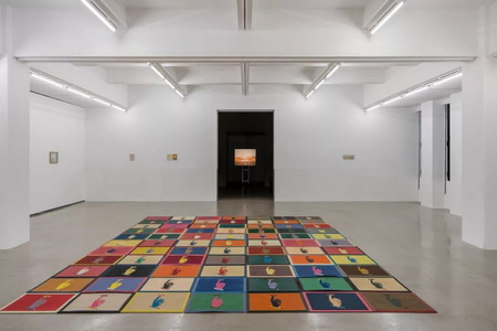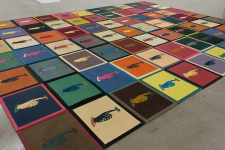 在展厅正中,100个带有墨西哥本土风格的橡胶垫《无声》(Silencio,2003-2010年)整齐摆放于地面,画面均呈现一根手指压于唇上做出“嘘”的手势的图像,热闹的色彩、商品化的陈列、庸常(banality)与被迫沉默的暗示如同一场现实生活中习以为常的悖论。