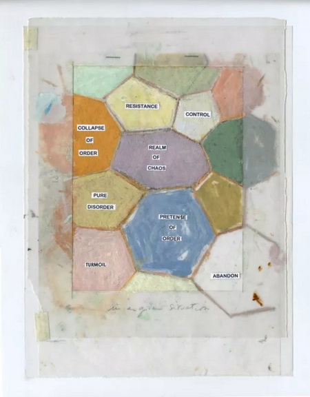 十年的追逐风眼的行动体现了弗朗西斯·埃利斯在极端的混乱状态下与秩序的博弈,如同唐吉诃德大战风车巨人之骑士精神与乌托邦抗争的隐喻,这种对内部有序时刻、内爆与外爆的研究与寻找在美术馆三楼所呈现的一系列相关手稿中可见一斑。在16幅《关于龙卷风的研究手稿》(Studies for Tornado)中,他试图通过抽象化的画面、身体与感官的经验描绘出“在一个给定的情境下”(in a given situation),个体面对控制、不安、恐惧、无序、混乱、崩塌的秩序等情状时所作出的作战计划。
