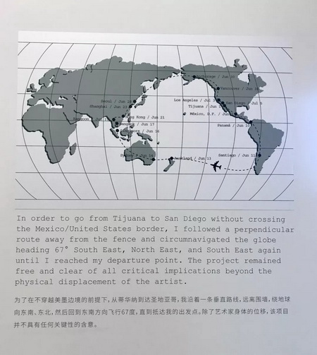 零星被置于美术馆各个角落的还包括埃利斯最新于内蒙古海拉尔创作的绘画《内蒙古系列》以及其1997年意图避开美墨边境而进行的反其道而行的旅途项目《环行》(The Loop),从墨西哥城经过南美、大洋洲和亚洲的12个国家和14个城市,最终到达圣地亚哥,呼应了艺术家在身份与身份之间、沉思与干扰之间、介入与观察之间一个“旅行者”(turista)的“行走/散布”(walking)的状态或态度,以及其作品中常被提及的关于“边境”议题的思考。