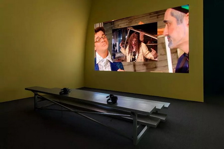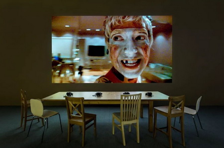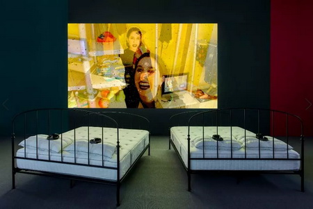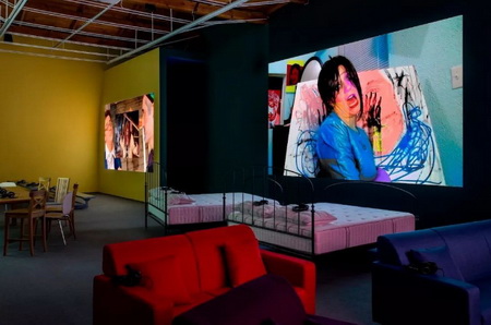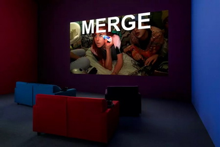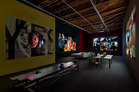 走进池社的展厅,瑞安·特雷卡丁(Ryan Trecartin)的四件录像作品让空气变得焦躁晕眩起来。即便空间中温馨地布置着沙发、床和桌椅,营造出一种家庭客厅和卧室的氛围,但每件作品里不断迅速切换的场景、人物夸张的表情和装束以及因为被加速而变得尖锐刺耳的嗓音,让人一下子陷入了一个无法整理出思绪的异次元世界。