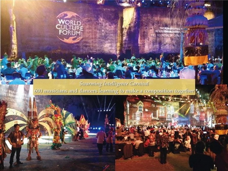 上图是最后一个例子。在这个演出中,我们观察一群鸟或一群鱼是如何移动的。接着,用这个移动的规则为印度尼西亚600位舞蹈演员编舞。
