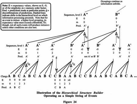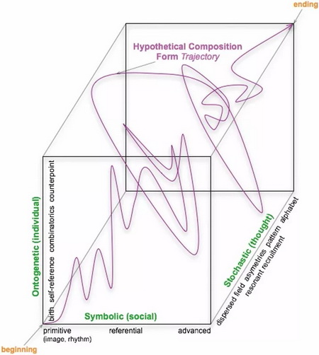 这张图的命题音乐作曲模型名为《判断系统》(Systems of Judgment)。这个作品的结构是根据三种不同语言生成的方式构成。第一种从一个单一的认知开始,然后它将援引自身,由此衍伸出另一个认知,最终这个意义串会形成一个庞然大物。第二种从随机的念头开始,在这一片无序中,会有一些特别突出的念头被我们注意到。第三种则映照着思想如何键结,最后如何形成复杂的象征系统。