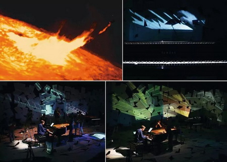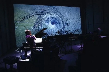 这张图是另外一件作品,《影响之区》(Zones of Influence),我弹钢琴并拉小提琴。在这首作品中,一起创作的还有一位打击乐手。我们制造出的音乐会传送到一台计算机里。这台计算机的程序会接收音乐,并且改变音乐的质地。同时,现场有视觉艺术家,他的计算机同样接收现场的演奏,然后艺术家根据所接收到的音乐,直接制作投影在舞台上的影像。