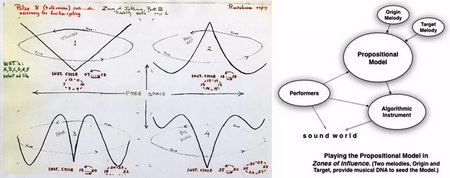 上图表现的是,新的理解乐器的方式可以如何扩增、改变、丰富一个音响或一段音乐生成或创作的过程。一般来说,我们每次弹一个键、拉一个弦的时候,随着它的振动,我们听到了这个乐器。那么现在,如果我们加入了“命题模型”(Propositional Model),在演奏的同时,这个模型也开始接收并且运算,然后发出不同质地、结构的声响地景。可以说,这个模型本身就是能够被演奏的。