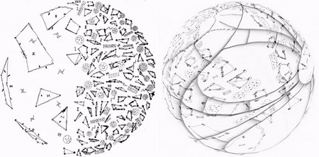 上图是一个模型,这个模型使用图像向我们显示出声响的起始、转变及其终止点。它是一段可以用任何乐器演奏的音乐,这份乐谱在1967年完成。我将这个图形做成一个3D的球,然后想象,如果音乐家置身其中,他将会看见这些图形如星空般展示在他的周围。因此,当他弹奏的时候,他是在音乐当中,而不是盯着眼前的乐谱。