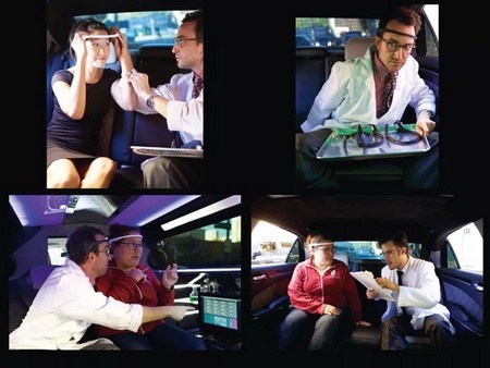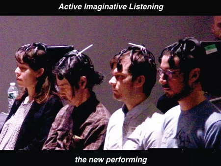 这张图是另一场演出。在这个演出里,观众搭上加长型轿车在洛杉矶市区驰骋。在每一辆车里,会有不同歌剧片段的现场演出和录音。观众在欣赏表演的同时,会戴上脑波的观测器。乐曲对观众的影响,会反馈到他们听到的录音片段的质地。也就是说,表演者和听众再度生动地透过听觉进行对话。