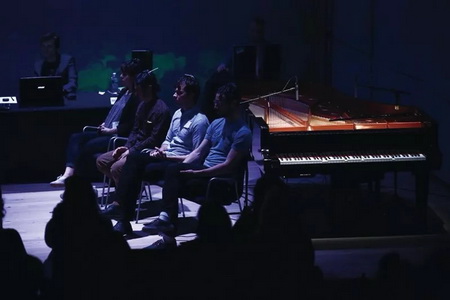上图是四个表演者,我们观测他们的脑波。虽然他们是四个人,但我们把他们当作“一个”巨型大脑。当巨型大脑产生共振时,就会引起声响,投影幕上也会随之出现色块。我的想法是,倾听本身就是一种表演和生产,所以图中的表演者一上台,他们的大脑就已经在活跃地制造图像跟声响了。然后,他们听见自己制造出来的声音,接着,又制造出更多的声音响应最开始听见的。这个时候,音乐家加入他们,在我们眼前的是一整个乐队。表演者持续聆听,他听见了音乐家的音乐,以及他们自身聆听的状态生产出来的音乐。这个过程可以一直延续下去,参与的人最终听见自己如何听见。