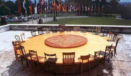陈箴:不管怎样,根据我有限的经历,一件作品的第一版总是最好的。"圆桌"是在非常困难的情况下在露天地里装成的,装成以后和环境非常和谐,而且这件作品和联合国大厦之间形成了一种强烈的对话。