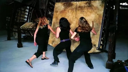 拿鼓的那件作品(编者注:指《绝唱--各打五十大板》)为例,它原来是为特拉维夫艺术博物馆创作的,后来也在威尼斯的双年展展出。我在做这件东西的时候"放大"了背景,从"广角"转为"特写"。这就是说,我在耶路撒撒冷呆了两星期,不仅掌握中东历史的全球视角,也目睹了仍然存在的冲突。实地住在那儿使我尽可能真切地体会到了敌意。我用佛教说法"各打五十大板"作业这件东西的理念。我思考博物馆空间的不同方面,深入每一个细节。例如这一楼层可以表示转变,一个巨大的楼梯和两根巨大的竖直圆柱都必须包括在作品中。但是我也想过这件作品在其他环境中该怎样展示。在博物馆展出的只不过是这件作品的最终形式。