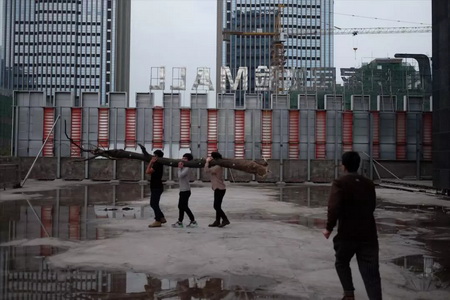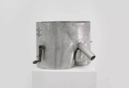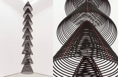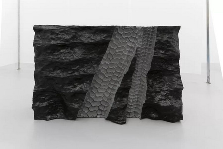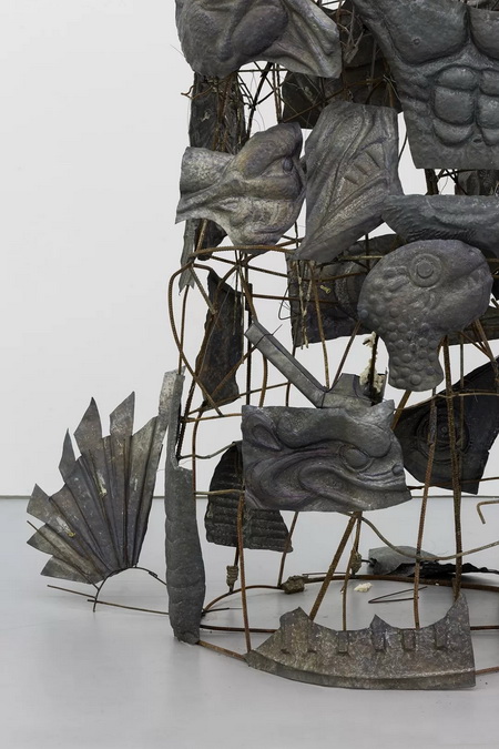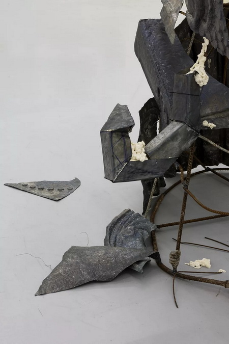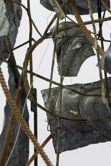 ▲ 《拼拼凑凑的利维坦》,2018,铅皮、钢筋、铁丝、水泥、钥匙、泡沫膨胀剂,350(h) ×150(Ø) cm。