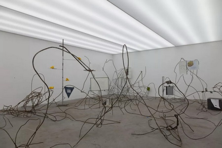▲ 《雨水》,2018,机械装置、钢丝绳钥匙、马达、调速器;Vacancy 画廊展览“祝福”现场,2018。