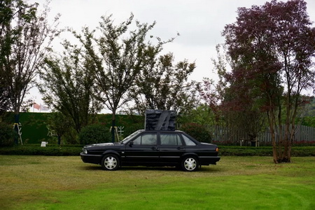 ▲ 《风滚草》,2018,监视器、铁球、监控摄像头、电动伸缩杆等,Ø90cm。