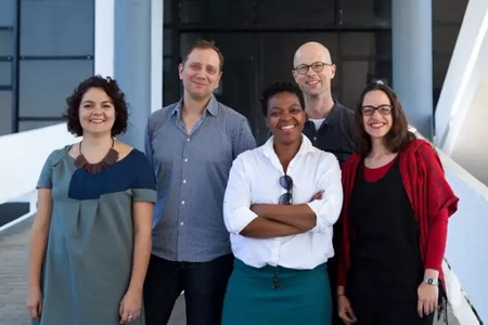 ▲ 第32届巴西圣保罗双年展策展团队合影,左起:联合策展人Júlia Rebouças、总策展人Jochen Volz、联合策展人Gabi Ngcobo、Lars Bang Larsen,以及Sofía Olascoaga