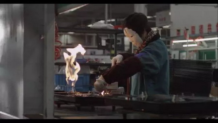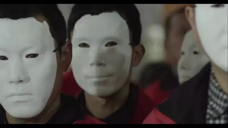 “伪装”建立在拉康式的镜像理论之上,通过对社会身份的摧毁,由此唤醒群体中个体意识。作品中的面具原样复制了员工们的面部特征,更是将他们的情感推动到了近乎戏剧化的程度。镜头的慢动作编排,使得员工在流水线上的机械劳作如同舞蹈般动人,揭示了工作中不为人知的另一面。