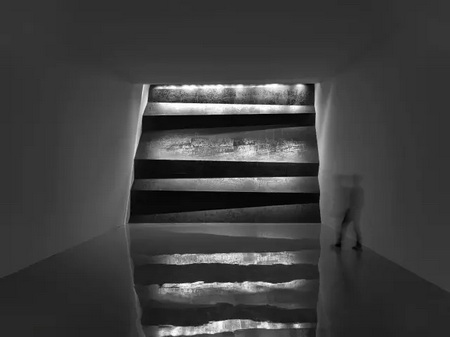 《天空之墙》是一件具有纪念碑性的、多维的纸上着墨作品,放置在一个由半反光的地板与倾斜的墙面搭建组成的空间里。
