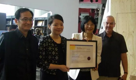 ▲ 2014年获奖人崔灿灿和翁子健接受典藏艺术家庭社长简秀枝与温哥华美术馆馆长巴特尔丝颁奖。