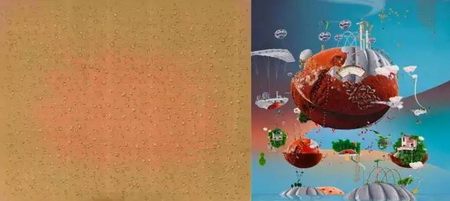 ▲ 由左至右:金昌烈《水珠》,182 x 227 cm,1975 年;Thukral & Tagra《Dominus Aeris-Panis Quotidie_1》,183 x 183 x 7.62 cm,2016 年,图片来源:艺术家本人及艺术门