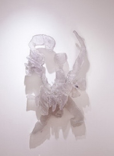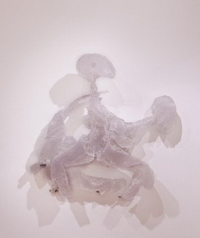 在这次于阿斯彭艺术博物馆举办的展览中,海恩斯创作了一系列探索雕塑透明度的新作。这些作品不可思议地将单薄的透明塑料与几乎看不见的、少量的大脑物质结合在一起。透明度暗示了一层薄膜、一层在物理上起中介作用的物质,大脑则暗示了认知和控制,两者结合到一起则形成了一种可感知却又无形的媒介。